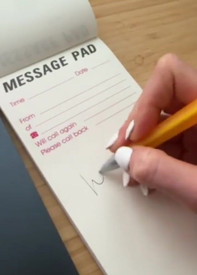 A close-up shows a hand with white nail polish writing "hello" and drawing a heart on a "MESSAGE PAD" notepad with a yellow pen