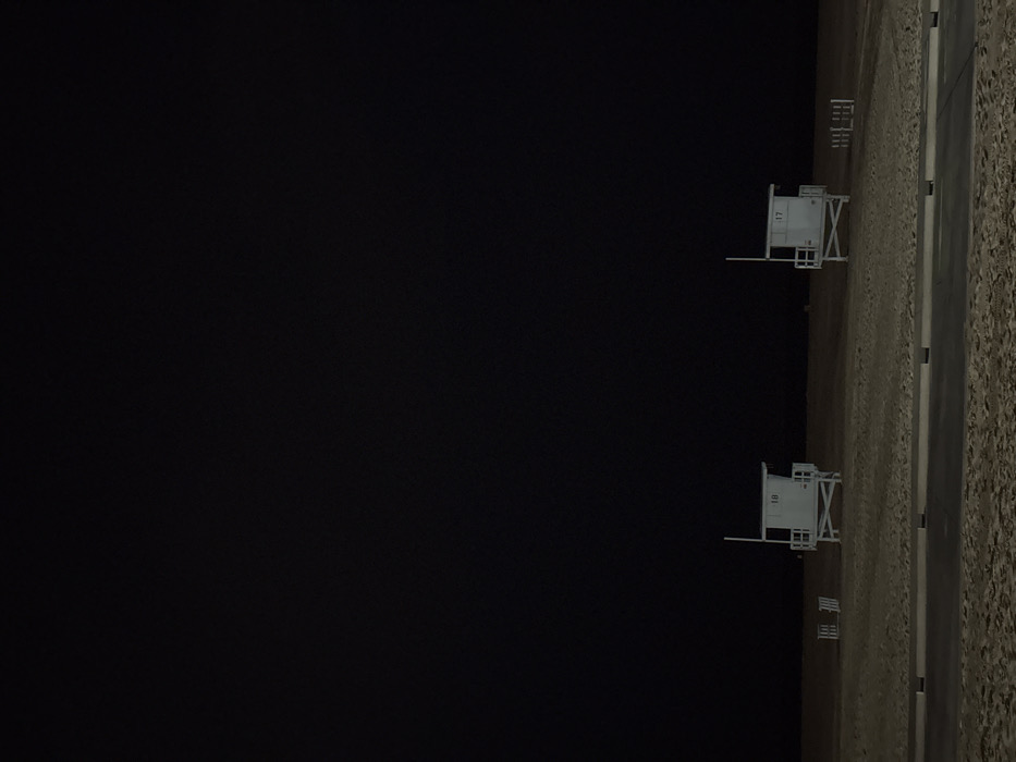 Two lifeguard stands sit on a beach adjacent to a paved road. The stands are white, numbered '17' and '18', respectively. The beach appears dark, with the ocean a solid expanse of blackness. Several sets of stairs lead from the beach up to the road. The beach is sandy and beige, contrasting with the darkness of the ocean and sky. The image appears to be taken at night or in low light conditions.