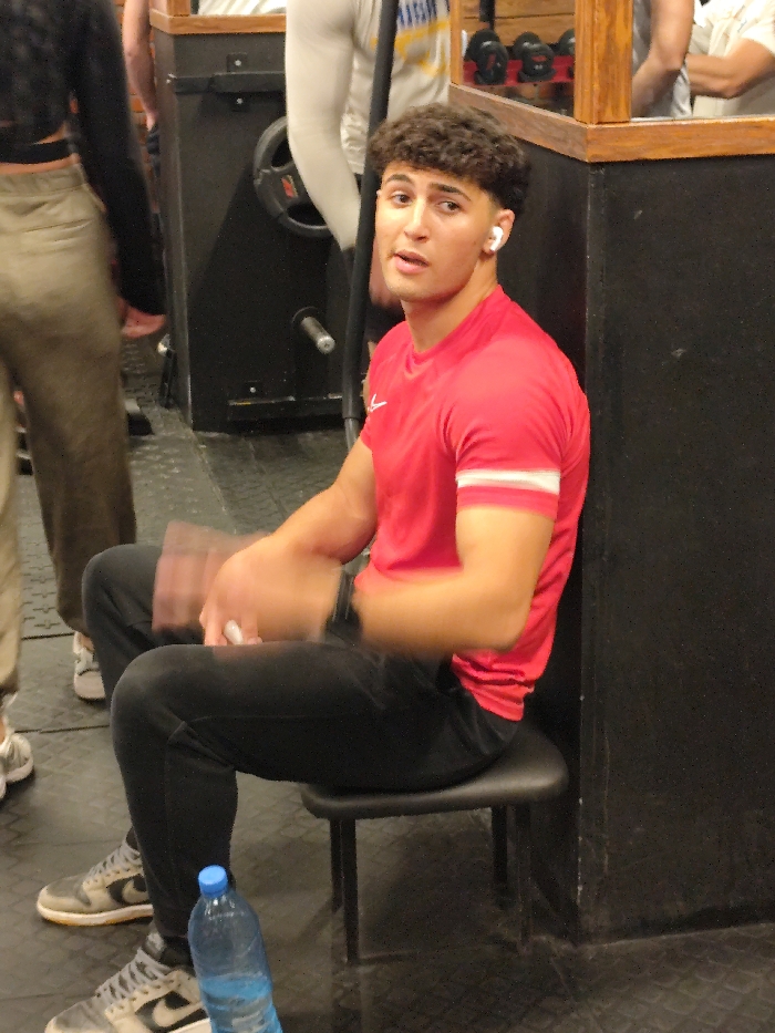This image depicts an indoor gym setting within the city of Joubar Municipality, Syria. The primary subject is a young adult male, seated on a dark, four-legged stool. He has dark, curly hair and light skin, and is wearing a red short-sleeve athletic shirt with a white Nike swoosh on the left chest and two horizontal white stripes on the left sleeve. He wears black athletic pants and grey and black Nike Dunk-style sneakers with white soles. A white wireless earbud is visible in his right ear, and a dark smartwatch is on his left wrist. His hands are blurred due to motion, appearing to be rubbing together or wiping something, with a dark, possibly reddish-brown towel-like object partially visible in his left hand. His head is turned towards the viewer, with his mouth slightly ajar, suggesting a moment of speech or reaction. To his left, another individual's lower torso and legs are partially visible, wearing light-colored trousers, a dark long-sleeve top, and light-colored sneakers, appearing to walk past. In the background, dark gym equipment, including a weight machine with a black weight plate and a silver bar, is visible. A dark pillar or wall section with a wooden trim borders the right side of the frame, behind which reflections of another person's arm and a light-colored shirt are visible in a mirror. The floor is dark and textured, consistent with gym flooring. A blue plastic water bottle with a blue cap rests on the floor in front of the seated male.