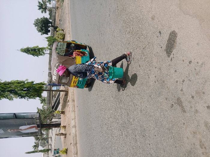 An adult female walks across an asphalt road in Kadoma, Zimbabwe, from left to right. She is dressed in a pink patterned headwrap, a dark long-sleeved top, dark trousers, and a blue and white patterned skirt, carrying a bright green plastic bucket in her left hand. Her footwear consists of open-toed sandals. Behind her, a stationary brown, yellow, and green three-wheeled auto-rickshaw, bearing the text 'PILOT STAR,' is visible. The background features a large billboard displaying a man in a white garment, tall green trees, an elevated road structure, and a dirt median. The road surface is asphalt with visible wear and stains, under a clear sky.
