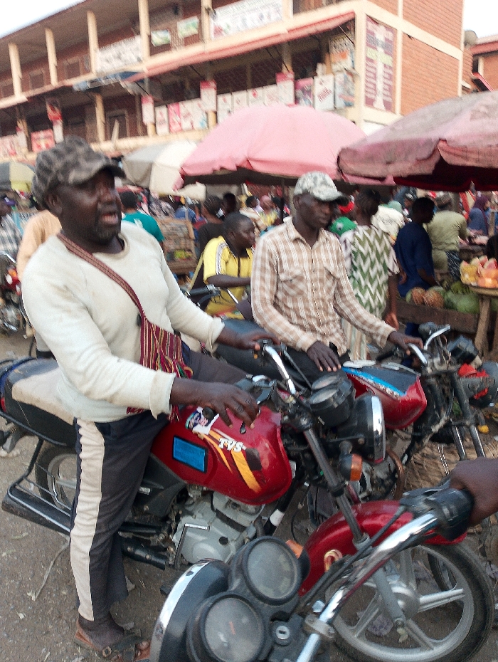 two men on motorbikes in a bustling outdoor market. The man on the left wears a light-colored shirt, dark pants with a white stripe, and a camouflage hat. He has a striped bag slung across his chest. The man on the right wears a plaid shirt and a light-colored hat. Red motorbikes are prominently displayed. In the background, a crowd of people can be seen among market stalls under pink and other colored umbrellas. A building with multiple stories and various advertisements is visible in the distance.