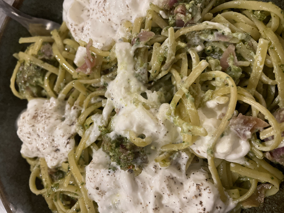 - "A close-up captures a dish of pasta, likely linguine or a similar long shape, coated in a vibrant green pesto sauce" by FM-nzIrg2, licensed under CC BY 4.0