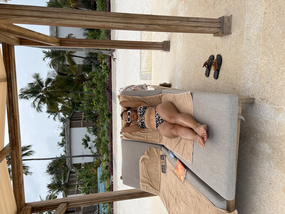 - "A woman in a leopard-print bikini and white sunglasses lies on a light-gray chaise lounge, relaxing under a wooden cabana structure" by FM-NrbZJ2, licensed under CC BY 4.0