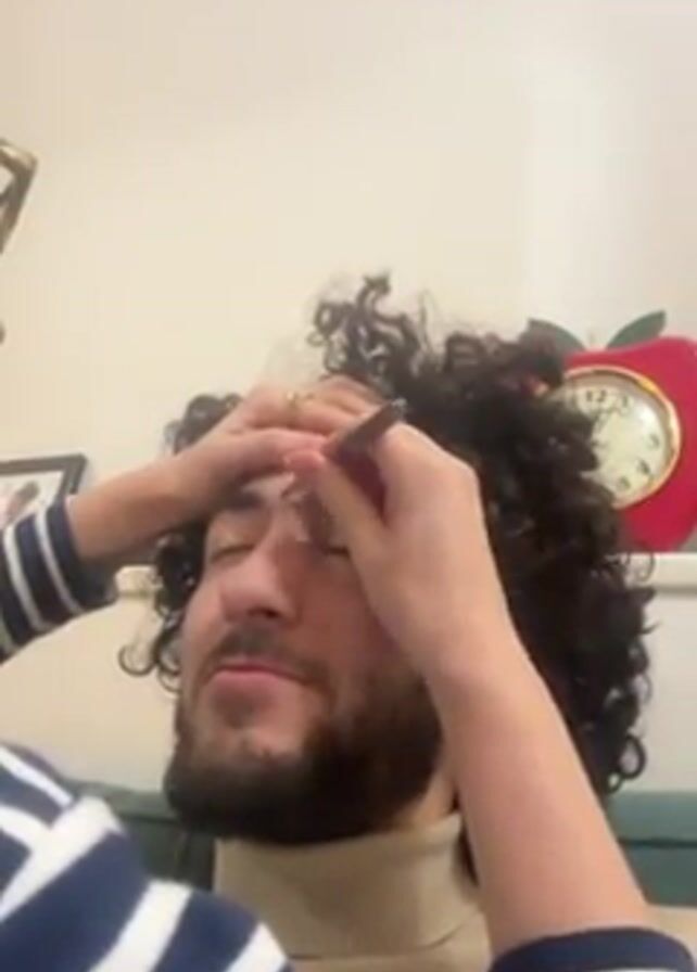 A person in a blue and white striped shirt is using a makeup pencil on the forehead of a person with dark curly hair and a beard. The bearded person is wearing a beige turtleneck sweater and sitting on a green couch. An apple-shaped clock hangs on the wall behind them. After the makeup application, the bearded person looks upward to their right.