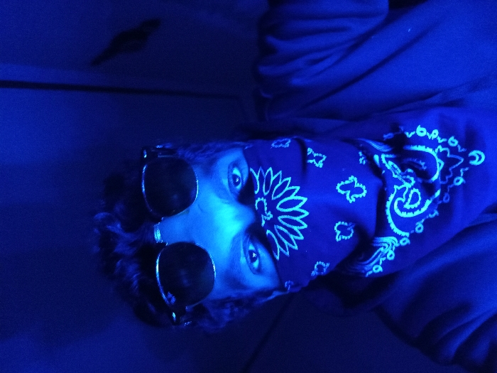 A person with sunglasses and a blue bandana covering their head and forehead is looking directly at the camera. The image is dominated by a strong blue light, casting the scene in a monochrome hue. The person's face is the focal point, with eyes visible above the bandana. A portion of their jacket or shirt is visible. The blue lighting creates a distinct and somewhat surreal atmosphere.