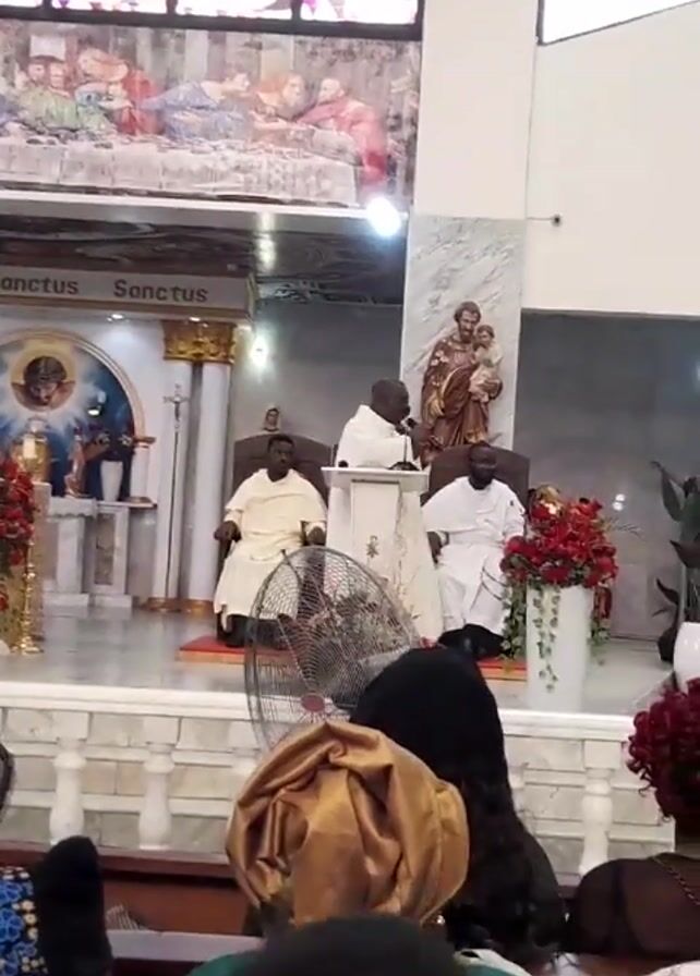 church service in progress. Three men in white robes are seated on a raised platform, with one man standing at a podium addressing the congregation. The backdrop includes a stained glass window depicting religious figures, a statue of Saint Joseph holding the infant Jesus, and decorative plants. The congregation is visible in the foreground, seated in pews. A standing fan is positioned in front of the platform, suggesting a warm environment.