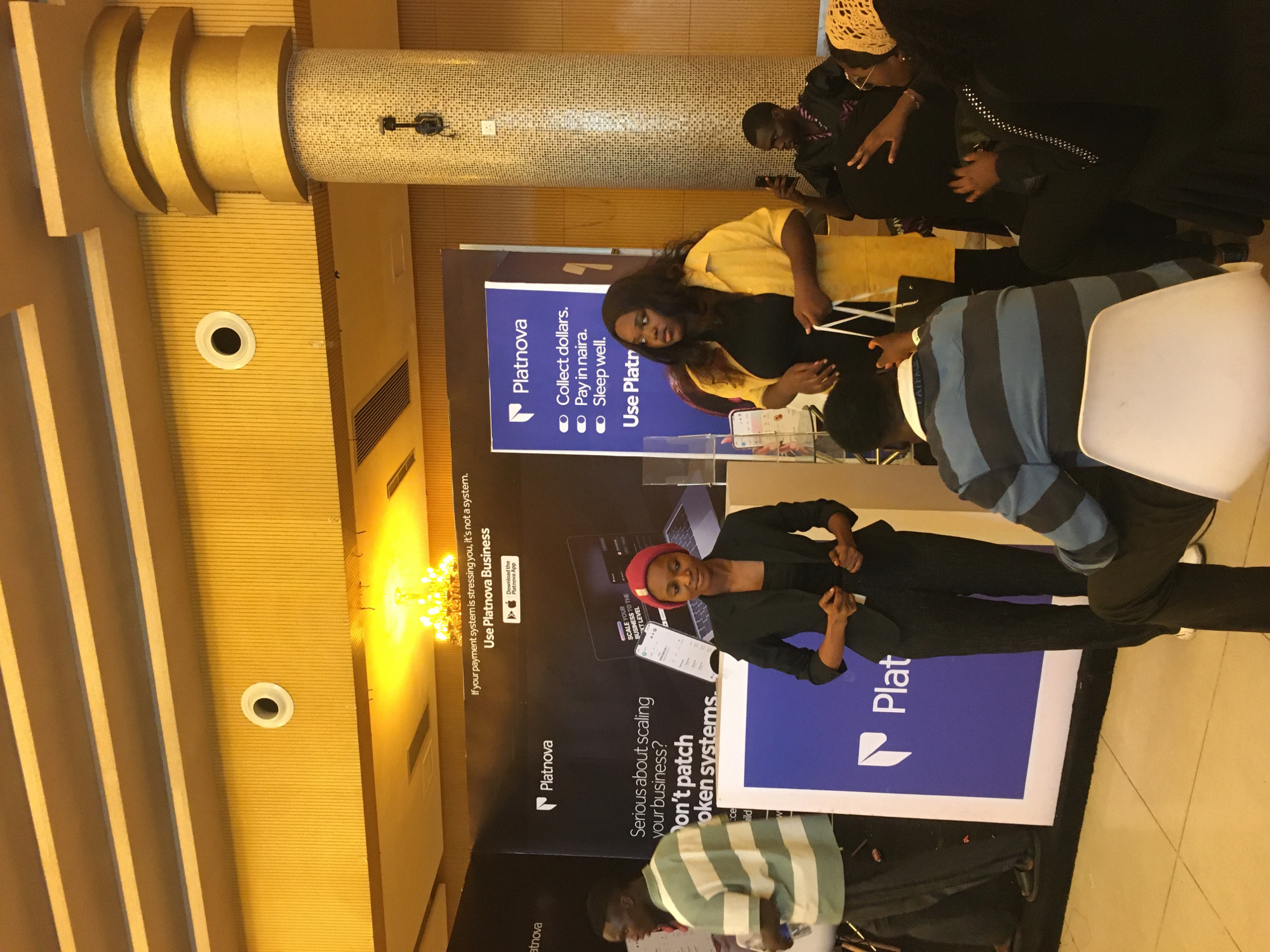 This image captures an indoor event within a large room, identified as being in Itirin, Nigeria. The environment features warm, yellowish artificial lighting emanating from a prominent brass-colored chandelier and recessed ceiling lights. The ceiling is characterized by multiple parallel, light-colored beams. The walls are paneled with vertical, light-brown strips, and a circular vent is visible on the upper left wall. A large, decorative pillar, adorned with small mosaic tiles at its base and larger, curved, gold-colored sections higher up, stands on the right. The floor is tiled with light-colored square tiles. In the central foreground, a woman stands with her body slightly angled, wearing a red beanie, a black blazer over a dark top, and black trousers, with white sneakers. Her hands are lightly clasped in front of her. To her immediate right, another woman stands, looking to her left. She wears a black top, a loose-fitting yellow short-sleeved shirt or jacket, and holds a white shopping bag with both hands at waist level. In the direct foreground, a man is seated with his back mostly to the camera on a white chair. He wears a blue and grey horizontally striped polo shirt and dark trousers, and his right arm is raised with an extended index finger, gesturing towards the left. In the background, two prominent "Platnova" branded banners are displayed. The larger, black banner on the left features white text, including "If your payment system is stressing you, it's not a system. Use Platnova Business" and "Serious about scaling your business? Don't patch broken systems," alongside illustrations of a laptop and a smartphone. The taller, narrower blue banner on the right lists "Platnova" benefits: "Collect dollars.", "Pay in naira.", "Sleep well.", "Use Platnova." On the far left, a man in a green and white horizontally striped polo shirt and dark pants is partially visible, walking. On the far right, several individuals are seated; one man in a dark patterned top holds a smartphone, viewing its screen, and another person with a light-colored, patterned head covering is also seated.