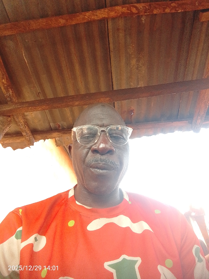 The image displays an adult male in Ejule, Nigeria, positioned under a corrugated metal roof structure
