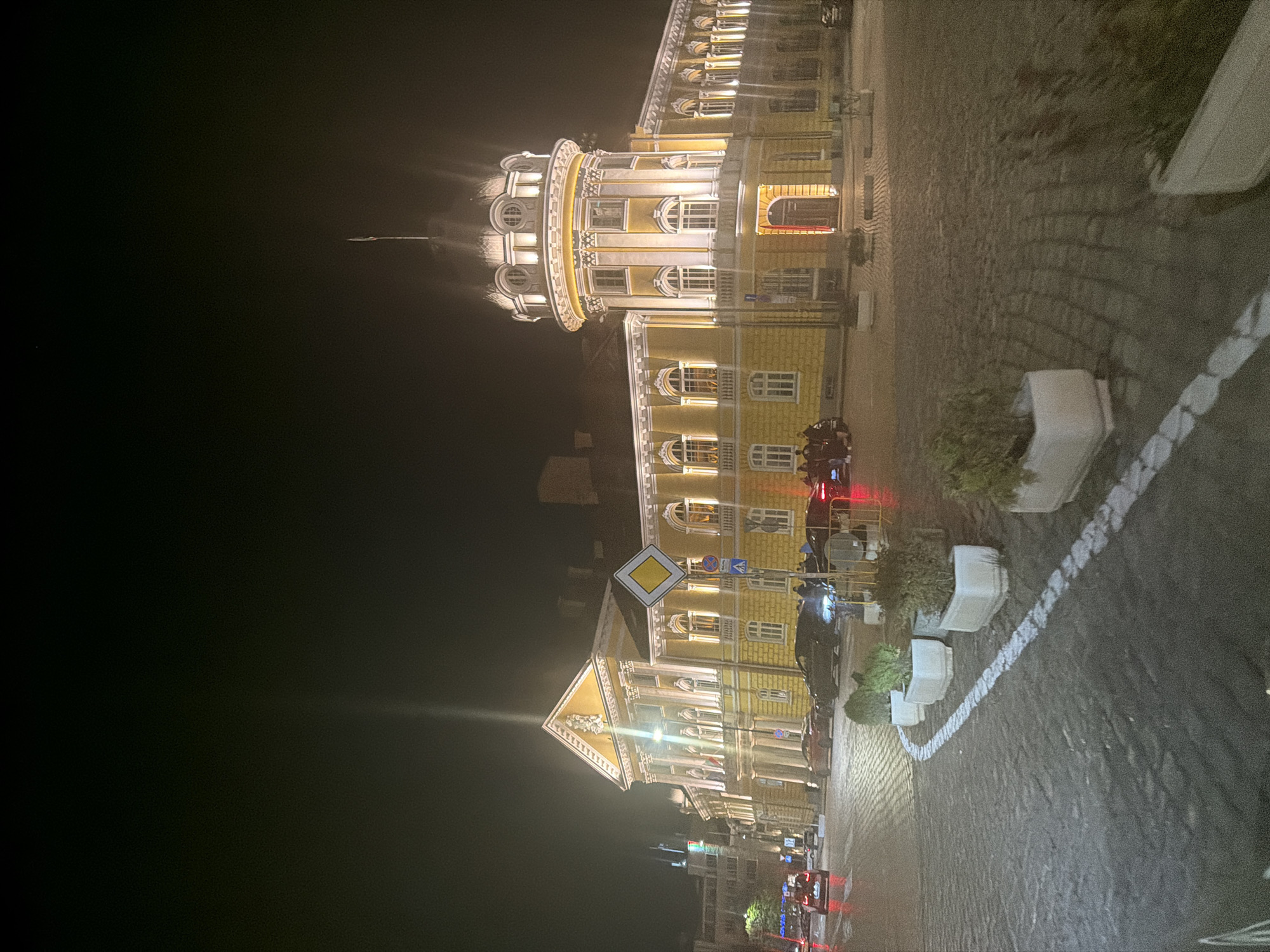 At night, a brightly lit yellow building dominates the scene. The building has ornate architectural details, including a tower with a rounded top. The street in front of the building is paved with cobblestones and marked with a white line. Several plants in white containers are placed along the street. A yellow diamond-shaped road sign is visible in front of the building. Cars and people are moving along the street. The scene appears to be in a city, possibly Sofia, Bulgaria, based on architectural style and street markings.