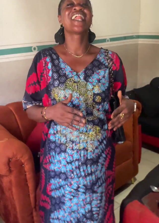A smiling, happy Black woman is standing indoors, wearing a long blue, red, and black dress with elaborate embroidery around the chest. She's accessorized with gold jewelry and a black purse over her shoulder. She's dancing and gesturing with her hands, clearly enjoying the moment. Behind her are two couches in orange and red, and a picture hangs on the wall. The room seems cozy and lived-in.