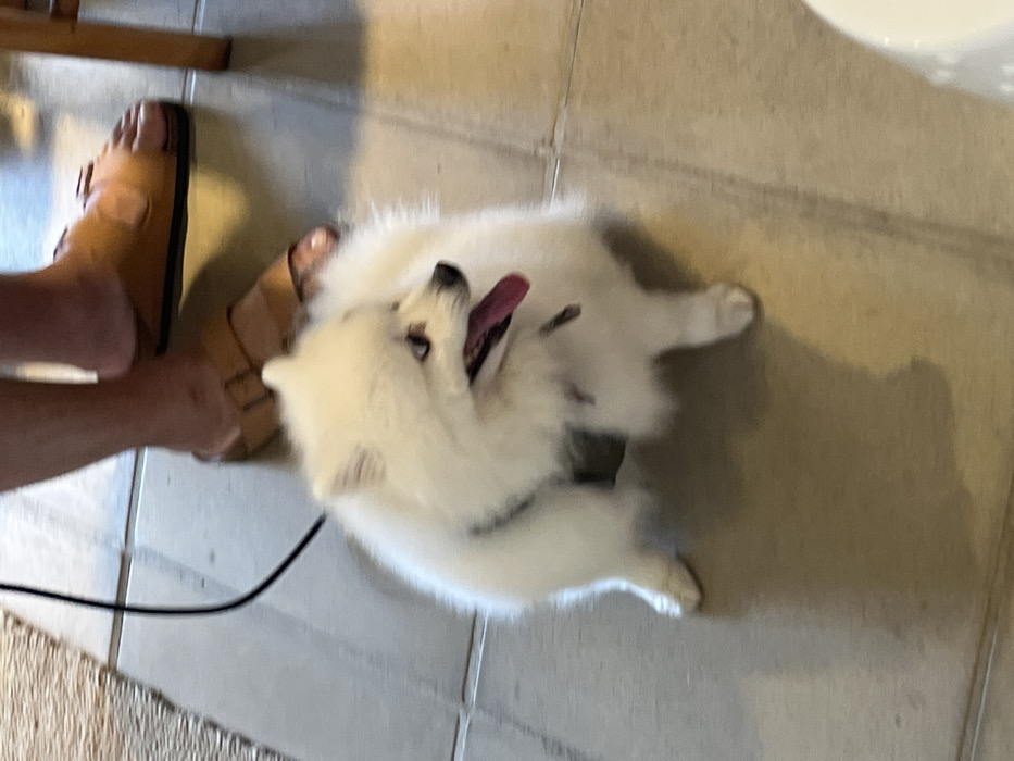- "A fluffy white dog, possibly a Samoyed puppy, lies on its back on a tiled floor with its tongue lolling out" by FM-hfpyn2, licensed under CC BY 4.0