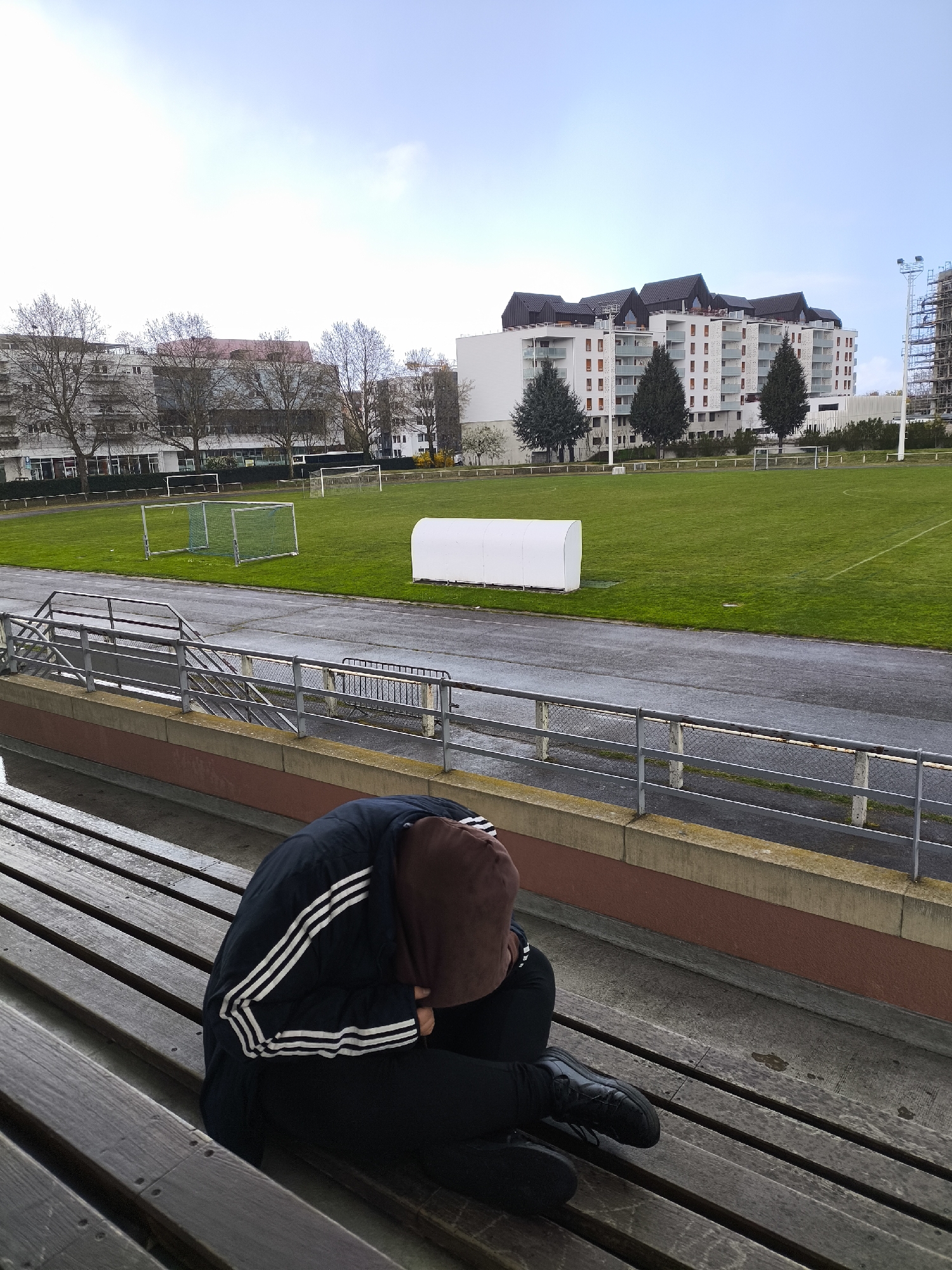 A person is sitting on a wooden bench in an outdoor stadium in Schiltigheim, France. The person is wearing a dark-colored jacket with white stripes on the sleeves and black pants. The person's head is covered with a brown hoodie. The person is hunched over with their head resting on their knees. The stadium includes a track, a soccer field with goals, and building structures in the background.