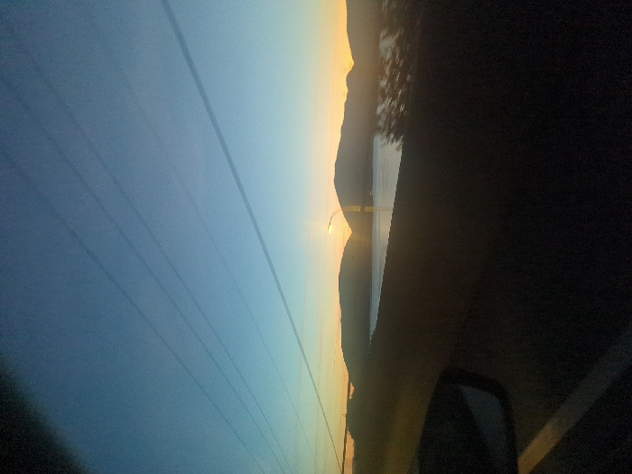 The image depicts a twilight scene, likely sunrise or sunset, viewed from a moving vehicle on a roadway in West Vancouver, Canada, overlooking a body of water such as Burrard Inlet or Howe Sound. The sky transitions from deep blue at the top to a vibrant yellow-orange at the horizon. Five to six parallel utility lines span the upper sky diagonally from upper-left to lower-right. In the middle ground, a large body of water reflects the sky's bright hues. Silhouetted mountains form the distant background beyond the water. A tall, illuminated structure, consistent with a street light or a section of the Lion's Gate Bridge, is prominent over the water to the right, casting a bright reflection on the surface. The immediate foreground shows a dark asphalt roadway with a visible white solid line and a faint yellow line near the bottom-left. The left side mirror of the vehicle from which the photo was taken is visible in the lower-left quadrant, reflecting parts of the road and sky. Blurred, dark vegetation lines the right side of the foreground, between the roadway and the water. No individuals are visible.