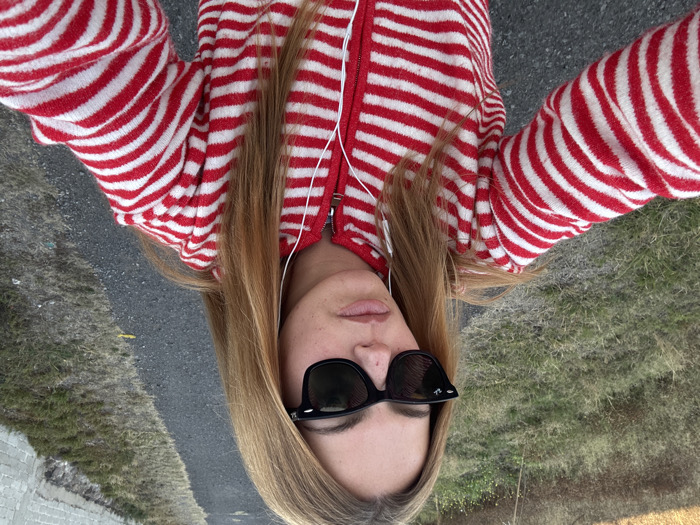 A person is wearing a red and white striped jacket and black sunglasses, with light brown hair and headphones. The picture appears to be taken at an upside down angle, showcasing the person's face, upper torso and surrounding environment. The background shows asphalt and grassy terrain, suggesting an outdoor setting. The lighting is natural, indicating it is daytime.