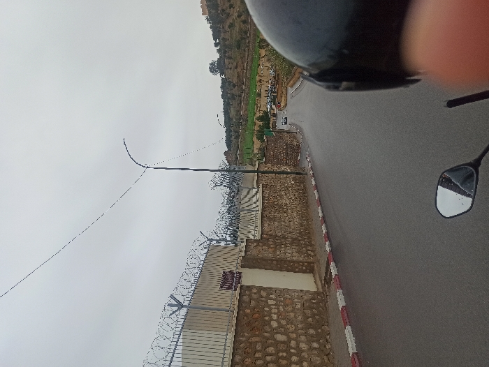 The image depicts a street scene in Fez, Morocco, on an overcast day. The viewpoint is from a motorcycle, evidenced by a partial black helmet visible on the right and a rearview mirror on the left, which reflects a blurred portion of the rider's leg or clothing. The asphalt road, appearing damp, stretches into the distance, sloping gently downhill. On the left, a substantial stone wall with reddish-brown masonry, approximately 1.5 to 2 meters high, runs parallel to the road. This wall is topped by a metal fence featuring multiple strands of razor wire. Behind the wall, a light beige building, also secured with razor wire along its roofline, is visible. A dark red sign with illegible text is affixed to this building. The curb along the left side of the road is painted in red and white stripes. On the right side of the road, the terrain rises into hills covered with sparse, dry-looking vegetation, including small trees and bushes. Several modern streetlights with curved arms are positioned along the roadside. In the middle distance, a white car is observed traveling away from the viewer on the road. Further in the background, a distant parking area with multiple vehicles is discernible. On a distant hilltop to the far right, a light-colored, fortified structure or ancient wall is visible. The sky is uniformly overcast and light gray, with overhead power or communication lines stretching across the frame. No specific individuals are explicitly depicted within the scene beyond the inferred presence of the motorcycle rider.