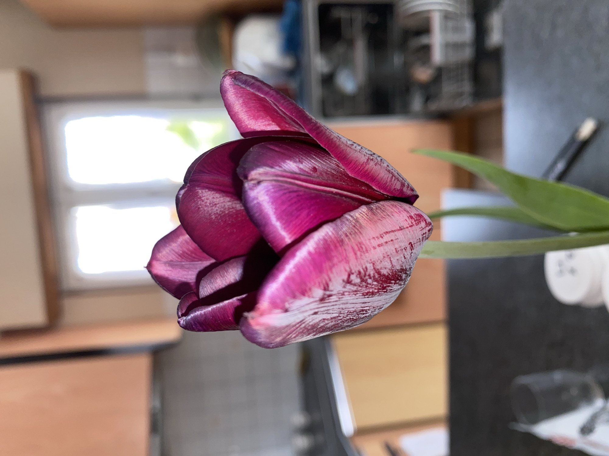 A close-up shot depicts a tulip flower with vibrant purple and magenta petals, exhibiting a slightly closed or budding form. The flower has a few green leaves. The background reveals an interior scene, possibly a kitchen, with blurry details of appliances (dishwasher), utensils, and a window. The location is unspecified; there is no information to suggest it's in Truchtersheim, France. There are no people in the image.