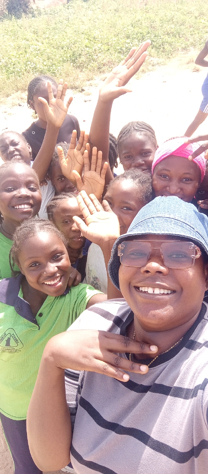 A group of approximately twelve individuals, predominantly appearing to be children and young adults, are depicted in an outdoor selfie taken in Kakau, Nigeria. The central figure, an adult female with dark skin, occupies the lower right quadrant, wearing a denim-style bucket hat, large rectangular rose-tinted sunglasses with visible embellishments on the temples, a grey and black horizontally striped short-sleeved shirt, and a gold-colored chain necklace. She is smiling broadly, exposing her teeth, and her left hand is positioned near her chest/neck. Behind and around her, multiple children and young adults are visible, mostly smiling and looking towards the camera. Several individuals have raised hands, as if waving. Notable figures include: - A young female in the lower left, wearing a light green polo shirt with navy blue collar and trim, featuring a logo that appears to include the text "LIBERTY ACADEMY" and a silhouette of the Statue of Liberty. She is smiling widely. - Another young female in the upper right, wearing a pink headwrap and smiling. - Other children in the mid-ground and background are wearing various casual clothing, including dark shirts and light-colored garments. Their hair is mostly styled in braids or cornrows. The background consists of a bright, sunlit outdoor area with sparse, light-green vegetation (bushes or weeds) on what appears to be a dirt or unpaved surface. The lighting suggests mid-day conditions.