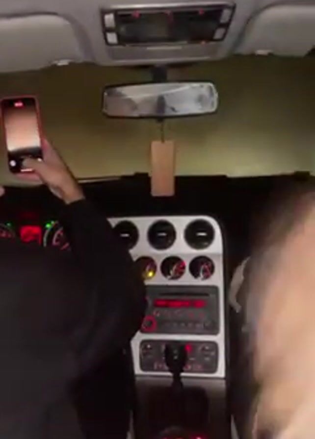 Inside a car at night, the driver is holding a red phone, possibly recording. A passenger sits in the front seat to the right, their curly hair briefly obscuring the view. The car's dashboard is visible with multiple gauges, red lighting, and a gear shift. There is a wooden air freshener hanging from the rearview mirror. A tan backpack is resting on the passenger seat.