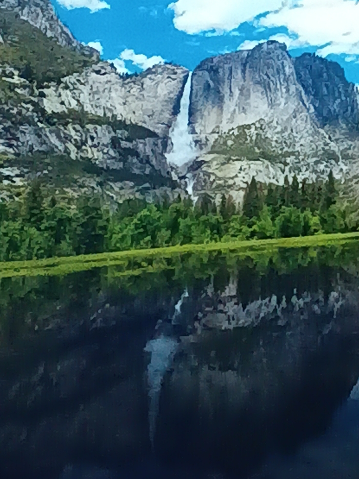 A scenic view of a tall waterfall cascading down a rugged, rocky mountain. Lush green trees fill the base of the mountain. Below, a body of water reflects the mountain and waterfall. The sky is blue with scattered white clouds, creating a vibrant backdrop.