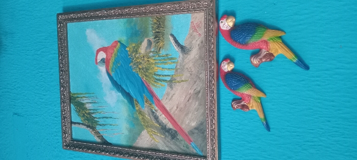 An interior wall in Duaca, Venezuela, painted a textured teal color, displays a collection of parrot-themed decorations