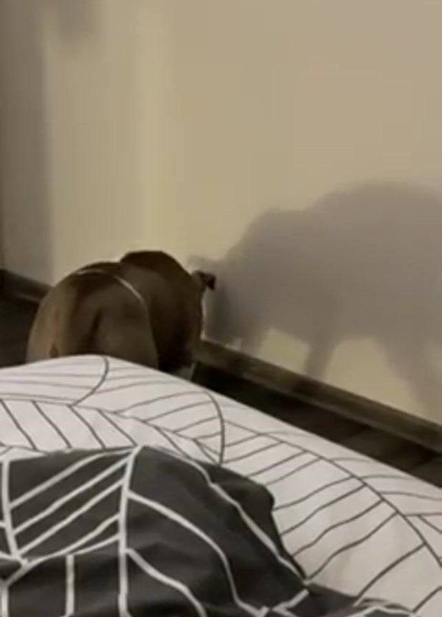 A brown dog stands with its head pushed against a wall near a bed with a black and white patterned comforter. The dog's shadow is visible on the wall. The dog's tail wags occasionally.