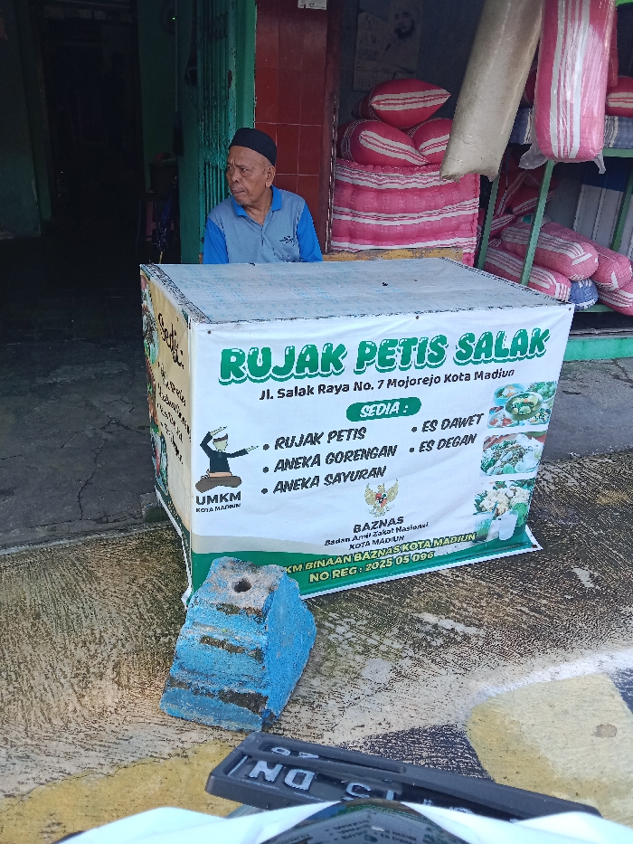 An elderly man wearing a blue shirt and black cap sits behind a white stand with a green banner that reads "RUJAK PETIS SALAK" and lists the items "RUJAK PETIS," "ANEKA GORENGAN," "ANEKA SAYURAN," "ES DAWET," and "ES DEGAN." The stand is identified as "UMKM KOTA MADIUN" and "BAZNAS Badan Amil Zakat Nasional KOTA MADIUN." Behind the man are stacked pillows. A blue-painted object is in front of the stand, along with a part of a motorcycle.