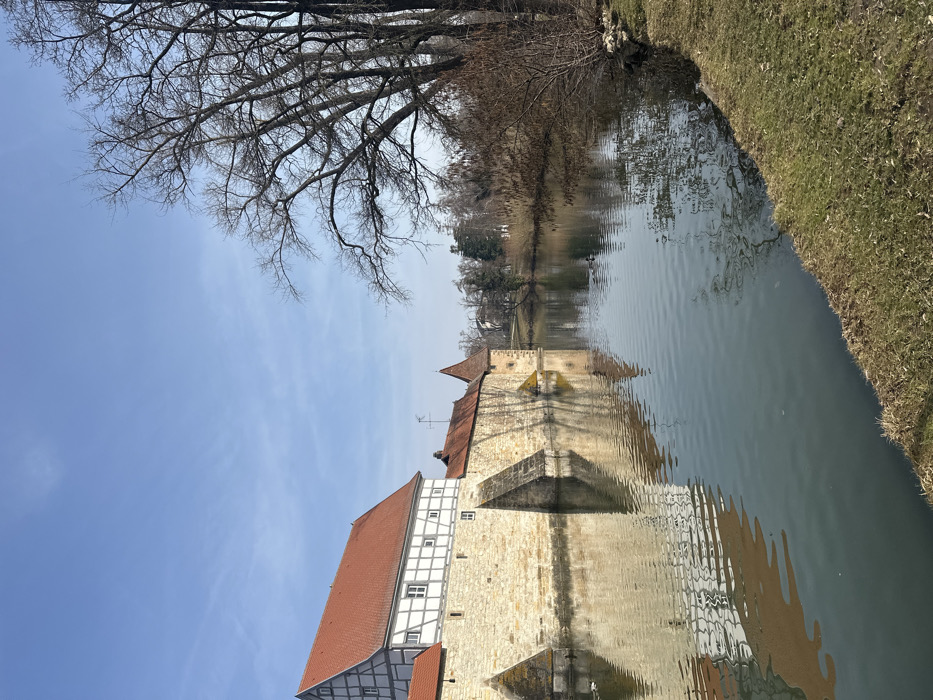 The image displays a sunny exterior scene in Weißenburg in Bayern, Germany, featuring a segment of the historic city wall and its moat. On the left, a multi-story building with a red-tiled gabled roof is prominent. Its upper section is constructed in a white half-timbered style with multiple rectangular windows, while the lower section consists of robust light-colored stone block masonry. Several angled buttresses extend from this stone foundation into the water. The stone wall continues horizontally to the right, forming a defensive structure alongside a tranquil body of water, culminating in a small, conical-roofed turret with a darker, pointed cap. Reflections of the architectural elements are clearly visible on the water's surface, distorted slightly by ripples. The central and right portions of the image are dominated by a dark greenish-blue body of water, likely a moat. Two dark-feathered waterfowl are present on the water's surface towards the right. The immediate foreground on the right consists of a grassy bank, exhibiting a mix of green and drier brown vegetation. Behind this bank, a dense cluster of tall, leafless deciduous trees with dark, gnarled branches rises, suggesting late winter or early spring. The background beyond the water features more distant trees and shrubs. The sky is clear blue with sparse, wispy white clouds, indicating a bright day. No human subjects or explicit human actions are discernible within the frame.