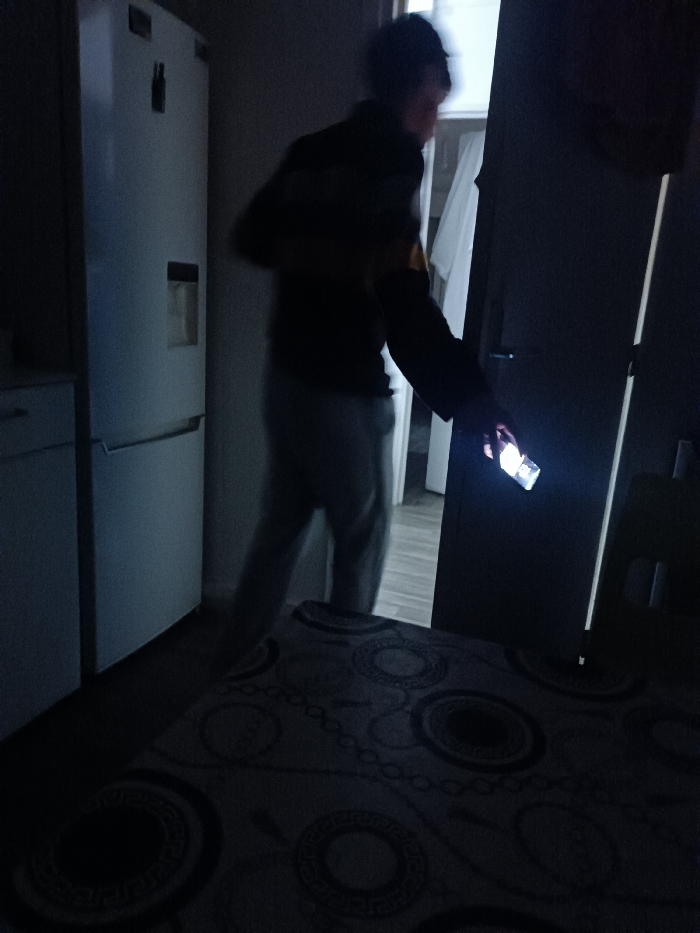 In a dimly lit interior, a person with a blurry face holds a flashlight, its beam illuminating a partially open doorway