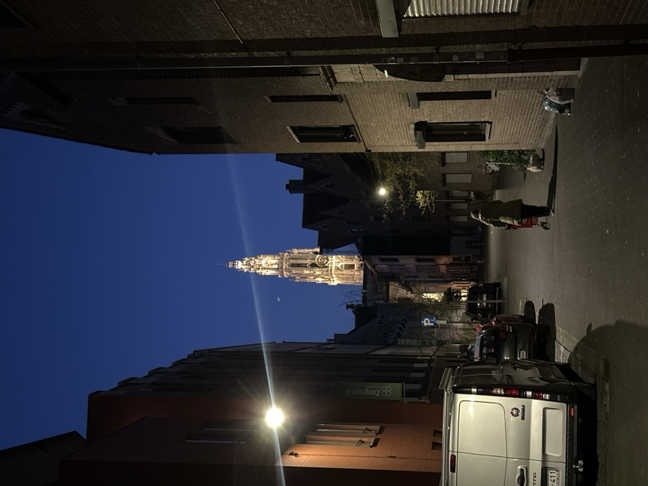- "An evening view captures a narrow street in Antwerp, Belgium, with the brightly illuminated spire of the Cathedral of Our Lady prominent in the background against a deep blue twilight sky" by FM-MHDnZ2, licensed under CC BY 4.0