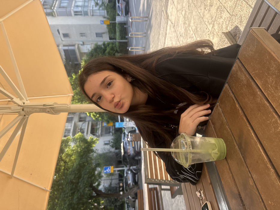 A young female, appearing to be in her late teens or early twenties, sits outdoors at a slatted wooden table, likely within the city of Tel Aviv, Israel