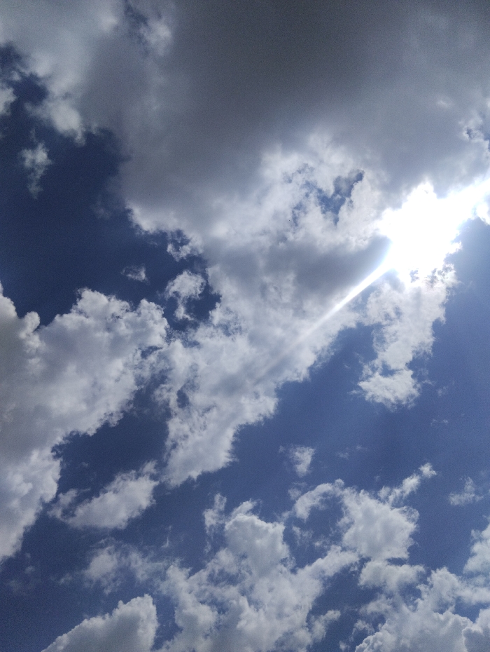 The image displays a daytime sky over Witeithie ward, Kenya, dominated by a mix of stratocumulus and cumulus clouds. The upper portion features a dense, dark grey cloud mass, transitioning to lighter, white, and scattered cumulus clouds towards the middle and bottom sections. Patches of clear, deep blue sky are visible between the clouds. The sun is positioned in the upper right quadrant, partially obscured by clouds, and emits a strong, bright diagonal light ray extending downwards and left across the frame. No discernible people, man-made structures, or terrestrial features are present within the view.