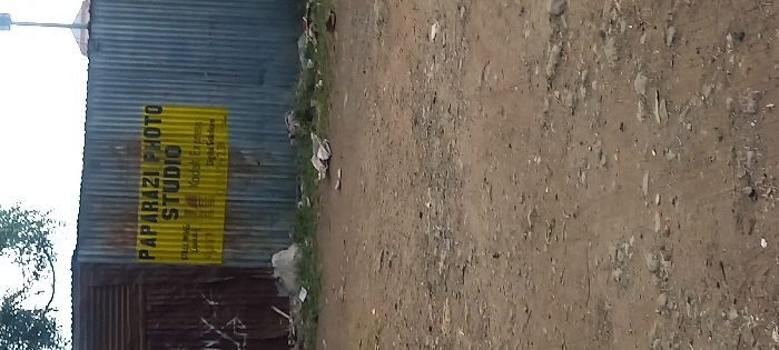 The image depicts an outdoor scene in Nairobi, Kenya, characterized by an unpaved area in the foreground and a structure composed of corrugated iron sheets forming the background
