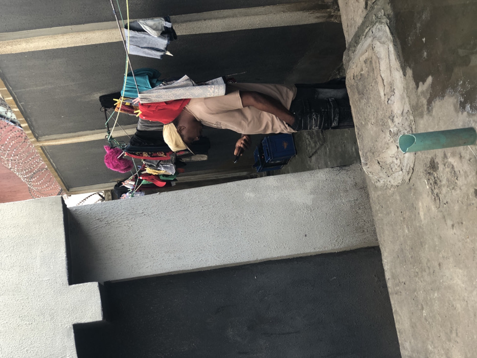 An outdoor, somewhat cramped space is depicted. Clothing hangs on lines, suggesting laundry. A person wearing a light-colored shirt and hat is visible, possibly using a mobile phone. A blue crate is near the individual. The concrete structure surrounds them. A green pipe protrudes from a wall. The walls are layered with black and gray paint. Barbed wire tops a wall section.