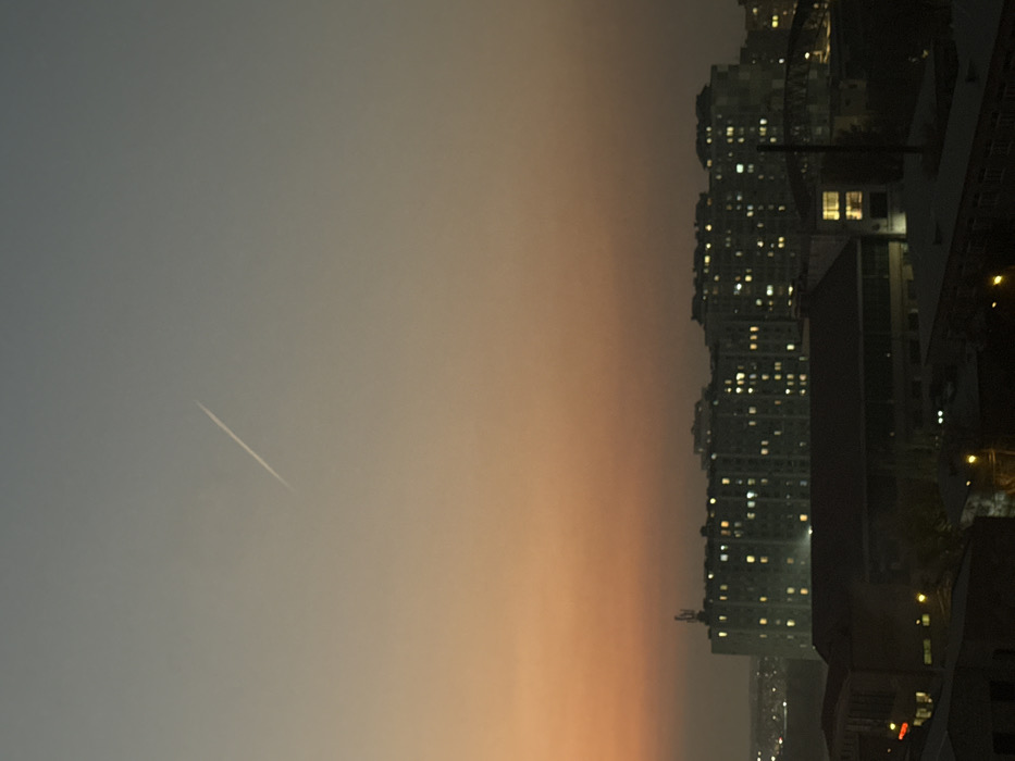 The image depicts a twilight cityscape in Yerevan, Armenia. The sky transitions from a light blue-grey at the top to a gradient of orange and red near the horizon. A single, distinct white contrail streaks diagonally across the upper left portion of the sky, indicating a high-altitude aircraft. In the mid-ground, a prominent row of multi-story buildings, likely residential or commercial, is visible. These structures are largely silhouetted against the vibrant sky, but numerous windows on their facades are illuminated, casting warm yellow and white light. A cellular antenna tower is faintly discernible on the roof of one of these buildings, towards the left. The foreground consists of darker, lower-rise buildings, possibly industrial or mixed-use, with some interior lights visible through windows and a few streetlights appearing as bright circular points. Further in the background, a faint line of distant city lights stretches across the horizon. There are no discernible people or explicit interactions in the frame.