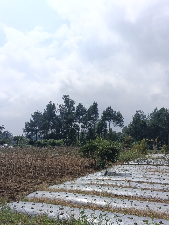 The image displays an agricultural landscape in Ea Tê, Vietnam, under a partly cloudy sky. The upper half of the frame is dominated by a light blue sky with scattered white and grey cumulus clouds. In the mid-ground, a dense line of tall, dark green coniferous trees, consistent with pine species, forms a prominent natural boundary across the horizon. Below the tree line, the foreground and mid-ground consist of cultivated fields. To the left and center, a section of exposed brown soil is visible, densely arranged with numerous vertical, slender wooden or bamboo stakes, forming a grid of trellises. To the right and extending into the immediate foreground, another farming area features multiple parallel rows covered with reflective silver or white plastic mulch. Small, vibrant green plants are visible emerging through circular cutouts in the plastic sheeting. A single, smaller deciduous tree with a green canopy stands between the trellised field and the mulched rows. No individuals or agricultural machinery are present.