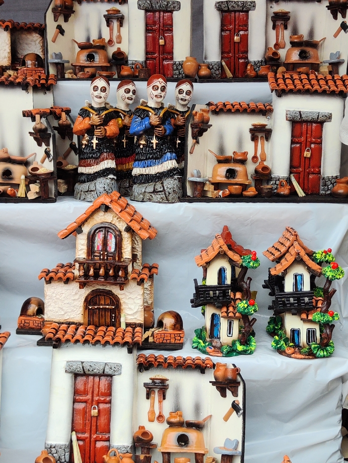 The image showcases several handcrafted miniature scenes. Some feature figurines with skeleton-like face paint, holding objects, standing amidst displays of cooking tools and miniature ovens. Other scenes depict charming, multi-story houses with orange tiled roofs, balconies, and tree-like structures with green foliage surrounding them. Red doors with padlocks are also a recurring element, adding to the detailed and whimsical nature of the artwork.