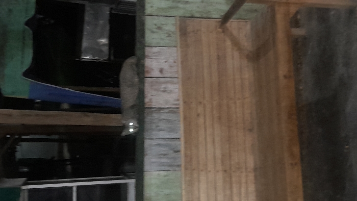 A raccoon peers from a dark and cluttered interior space. The raccoon is positioned along a wall constructed of stacked, weathered wood planks. Bright points of light reflect from its eyes. Beyond the raccoon, the interior features items like what appears to be a canoe, placed above a window and dark storage. A wooden structure frames the scene with new planks on the right and weathered support poles on the left.