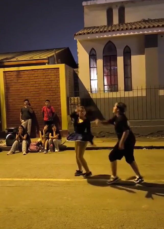 A pair of dancers perform on a street at night. The dancers, a woman with dark hair and a dark skirt and a male with spiky light hair, both wearing dark shirts, leap and twist to a Latin beat. They are dancing in front of a group of about ten spectators sitting against a low brick wall that has a tan painted top. Behind them is a two-story building with arched windows and a tiled roof. The street is dark yellow and illuminated by streetlights.