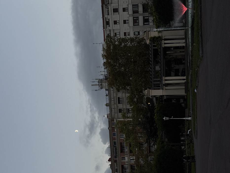 The photograph depicts a cityscape under a cloudy sky with a partial moon visible. A tall building dominates the scene, featuring numerous windows and antennae on its roof. Lush trees obscure parts of the building. A park area includes benches and a lamppost, and a fountain with red-lit water is visible. The image appears to be taken during dusk or dawn, creating a sense of subdued lighting.