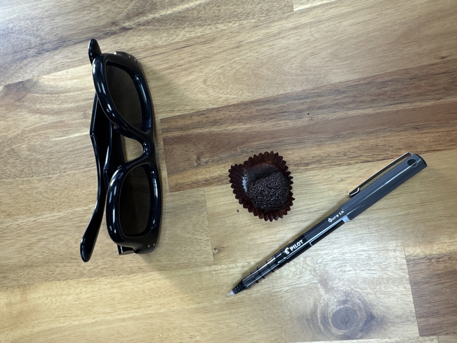 A flat lay composition on a wooden surface in Paleo Faliro, Greece, features three static objects. In the upper portion, a pair of black, thick-framed sunglasses with dark lenses rests horizontally, with the right temple arm partially folded outwards. Below the sunglasses, a single dark brown, spherical confectionery, coated in chocolate sprinkles, is contained within a dark brown, fluted paper cup. To the lower left of the confectionery, a black Pilot "Pure LK" retractable gel pen is positioned diagonally, with its tip oriented towards the upper left. The underlying surface is a light to medium brown wooden plank with visible grain patterns. No individuals or active interactions are present.