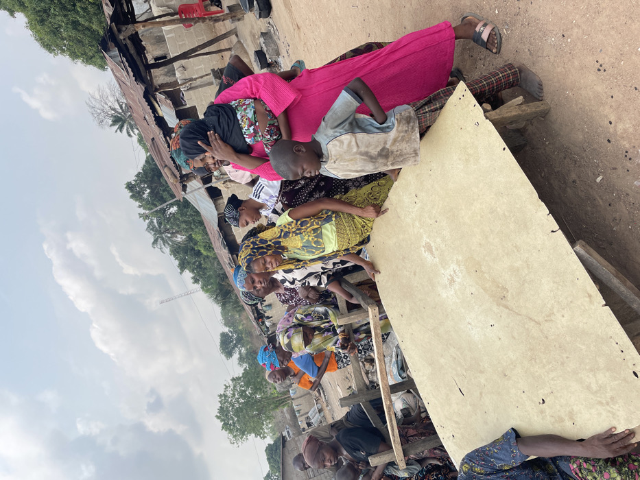 An outdoor scene in Osara Gada, Nigeria, depicts approximately a dozen individuals, predominantly women and children, gathered around a large, light-colored, rectangular wooden or composite board serving as a makeshift table