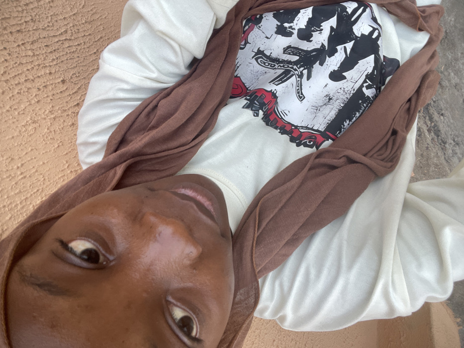 An individual faces the camera, tilted upward. The person has brown skin, dark eyes, and a brown headscarf. A white shirt with a black and red graphic covers the chest. A brown cloth drapes loosely over the shirt. The background is a mix of beige and gray, possibly a wall and ground. The image is taken from a low angle, emphasizing the person's face.