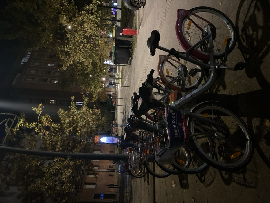 A row of rental bicycles are parked on a paved sidewalk at night. They are diverse in color, primarily silver, red, and blue, with one labeled "MIDI ICA". Street lights cast shadows on the ground. A building with lit windows rises in the background, and trees line the street. A street sign with a light illuminates part of the scene.