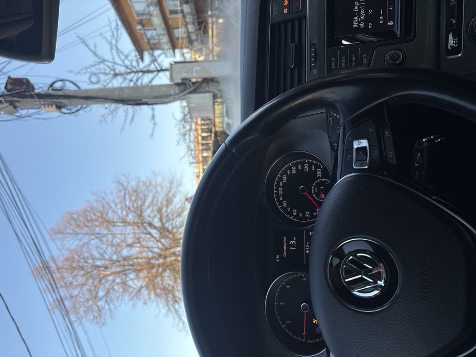 The image captures an interior view from the driver's seat of a Volkswagen vehicle on a street in Kyustendil, Bulgaria