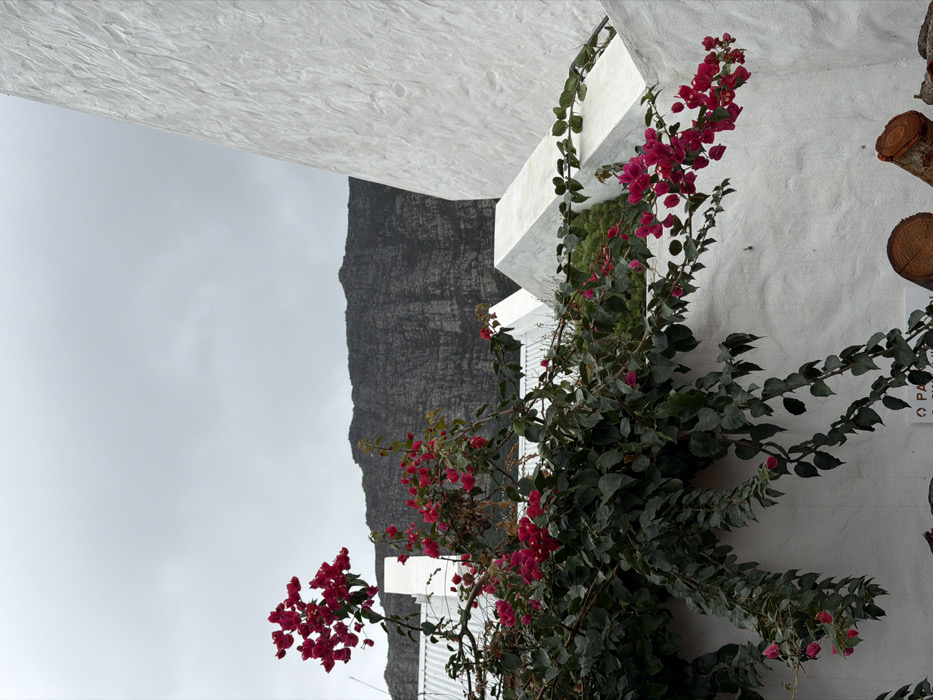 The image depicts an outdoor scene in Hout Bay, South Africa, under an overcast sky. A prominent bougainvillea plant with dark green foliage and clusters of magenta-pink bracts dominates the midground, extending across the left and center of the frame. This plant is situated against and spills over a roughly textured white wall that occupies the lower half of the image. To the bottom right, two cut wooden logs, one with a visible orange-brown cross-section, rest against the white wall. Behind the bougainvillea and white wall, several white-painted structures with corrugated metal roofs and sharp-angled gables are visible, consistent with local architecture. In the far background, a large, dark, rugged mountain with distinct rock formations rises beneath a uniform grey sky. No individuals or discernible actions are present.