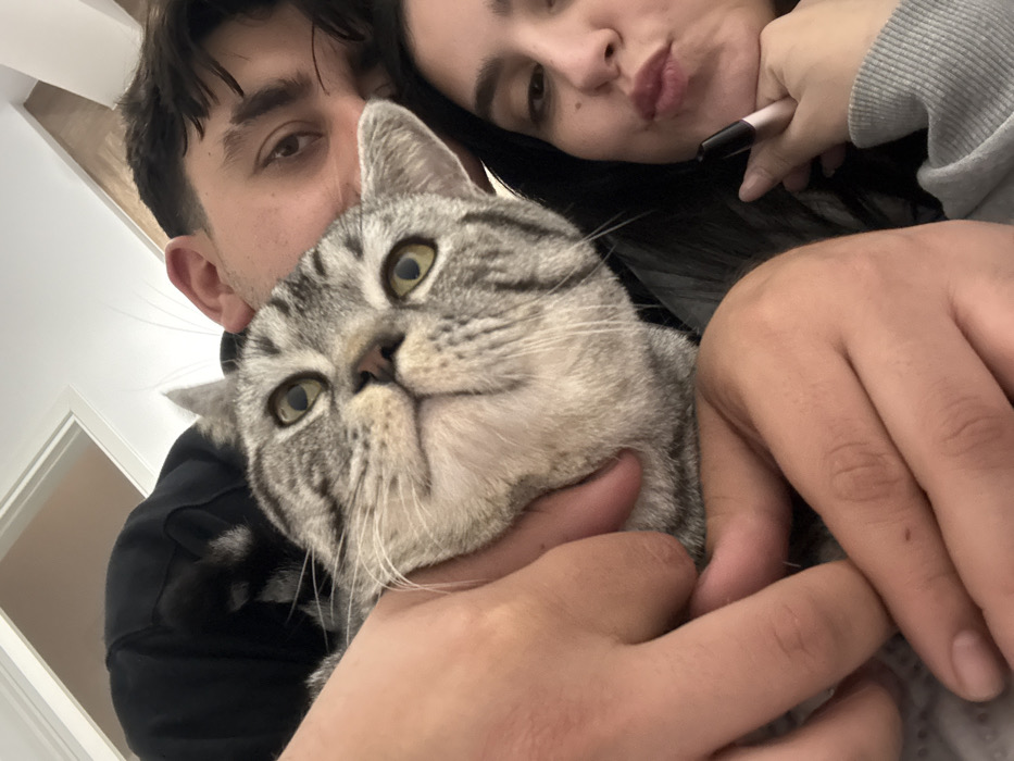 This image captures a close-up indoor scene in Latsia, Cyprus, featuring two human subjects and one feline subject
