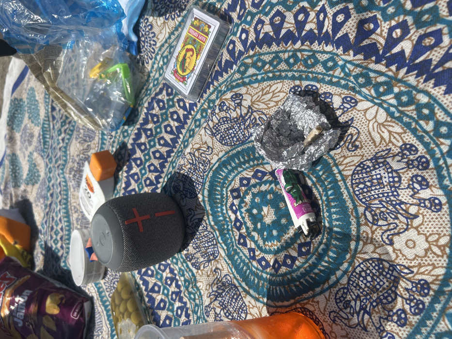 close-up of a picnic blanket with several items on it. The blanket is light brown with a repeating pattern of blue elephants on it. The items on the blanket include a black portable Bluetooth speaker with a red cross on it, a small plastic container with a pink lid, a white cylindrical container, a plastic bag of what appears to be green olives, a partially full glass containing a dark orange liquid, a silver foil packet containing what appears to be a rolled cigarette with a white filter, a pink lighter with a green cartoon face, a partially full bag of what appears to be potato chips, a white bag with some green items inside, a small plastic container, and a deck of playing cards with a yellow and red back and an illustration of a woman’s face on the front. The scene is located in the town of Adeje on the island of Tenerife in the Canary Islands, Spain (coordinates: 28.091, -16.743). It is likely that the image was taken during the day, outdoors, on the beach, as the setting suggests a beachside picnic.