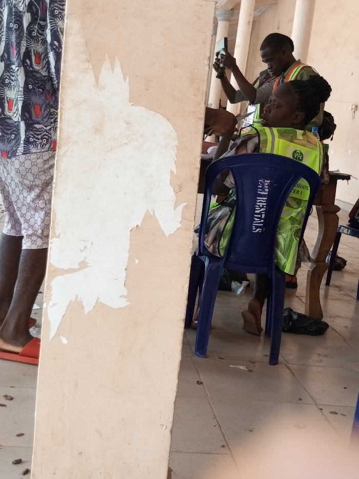 The image depicts an indoor or covered area in Ajalli, Nigeria, likely a public or administrative setting. In the foreground, a prominent beige structural column or wall section shows significant white paint or plaster peeling. To the immediate left of this column, a person's lower legs are visible, wearing white patterned shorts with a repeating dark logo, a dark patterned shirt, and orange slip-on sandals. To the right of the foreground column, a female individual is seated, facing right, on a blue plastic chair. She wears a bright yellow-green reflective safety vest over a patterned dress. The vest displays text, including "PO" and "PRESIDING OFFICER 1" on the back. Her dark hair is pulled back into an updo. The blue plastic chair has "BB RENTALS" embossed vertically on its backrest. Behind her, a male individual stands, holding a dark-colored smartphone horizontally at eye level, seemingly capturing an image or video to his right. He also wears a reflective vest. The background consists of light-colored walls and partial views of classical-style architectural columns behind the standing male. A wooden table or desk is partially visible behind the seated woman. The floor is covered with light-toned square tiles and shows scattered dark debris, possibly dirt or small stones, along with two black plastic bags situated near the chairs.