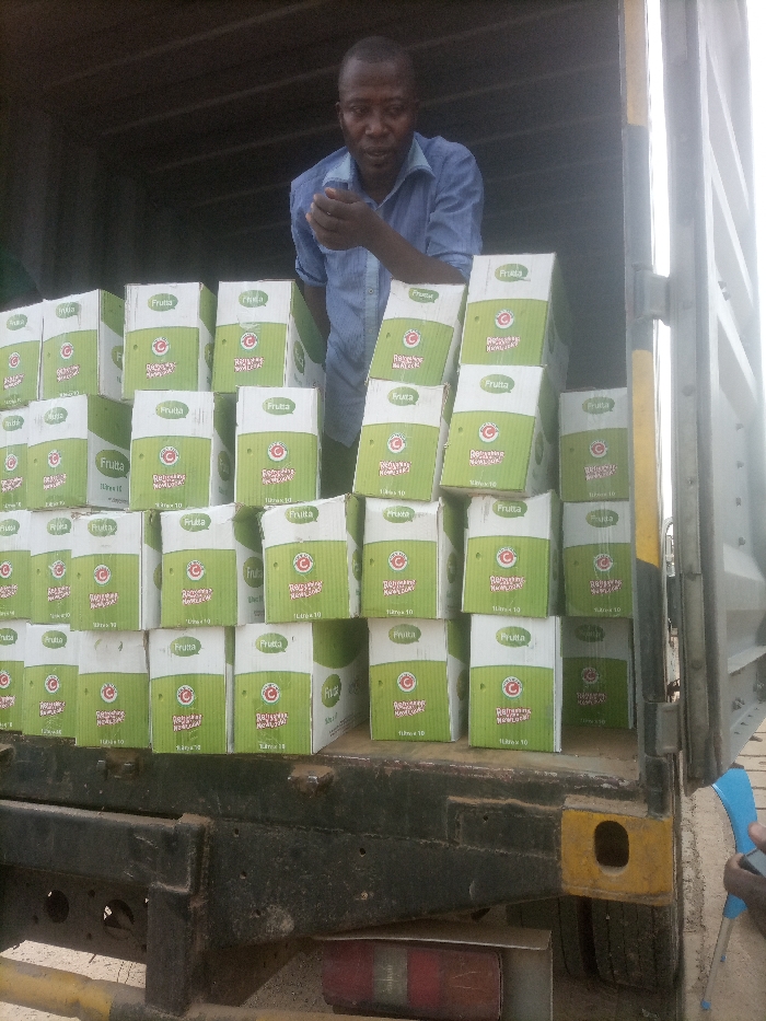 In Opete, Nigeria, a medium-shot image captures a man standing inside the rear cargo area of a dark-colored truck. Approximately 40-50 cardboard boxes, primarily white with green accents, are neatly stacked on the truck bed, forming a wall up to the man's chest. Each box displays the "Frutta" brand name, a circular logo with a red 'C', text "ROBINSON REGULARY NEWLY", and "1 Litre x 10". The man, of dark complexion, wears a light blue collared shirt and is positioned behind the stacked boxes, looking directly forward. His left arm rests on the top layer of boxes, while his right hand is slightly raised with fingers curled. A red taillight unit is partially visible at the bottom center of the truck's rear. A light blue plastic chair leg is visible on the ground to the right of the truck. The scene is illuminated by ambient light, suggesting an outdoor environment.