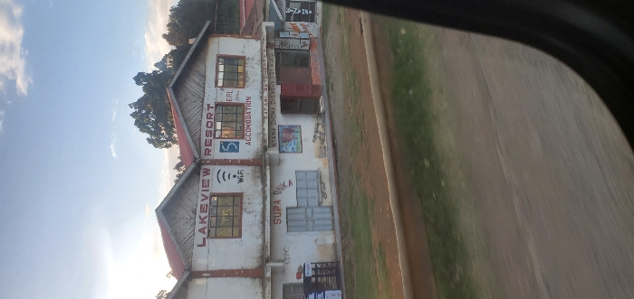 The image depicts a two-story commercial and accommodation building in Limuru Central ward, Kenya, viewed from a slightly elevated perspective, likely from a vehicle. The sky, visible in the upper portion, is light blue with scattered white clouds, suggesting daylight conditions, possibly morning or late afternoon. The building's upper facade, painted white, features a gabled roof section with red corrugated iron sheets. Prominently displayed in red lettering across the upper floor are the words "LAKEVIEW RESORT." Below this, a white Wi-Fi symbol with "Wi-Fi" is painted on the left, and a blue 'S' logo with "ACCOMMODATION" is on the right. Further right, "EPL 24hrs" is visible. Multiple rectangular windows with dark frames are present on the upper floor, reflecting ambient light. The ground floor consists of multiple storefronts. On the left, a blue metal double door is present, with "SUPA DUE" painted in red above it. To the left of this door, stacked white boxes or containers are visible. The wall surface is weathered, with visible dirt and some graffiti-like markings. In the center, a colorful mural depicting a cow is painted on the wall. Below the mural, text reads "KAYARI BUTCHERY" and "NYAMA CHOMA, CHENGA, FRY KUKU." To the right of the mural, a dark, recessed entrance, likely belonging to the butchery, is visible. The far-right section of the ground floor wall also shows signs and some red and black text. A strip of green grass separates the building from a dirt or unpaved road/path in the immediate foreground. The dark, curved frame of what appears to be a car window is visible on the bottom right. No individuals are depicted in the scene, and no overt actions or interactions are observed. In the background, behind the building, large green trees are visible against the sky.
